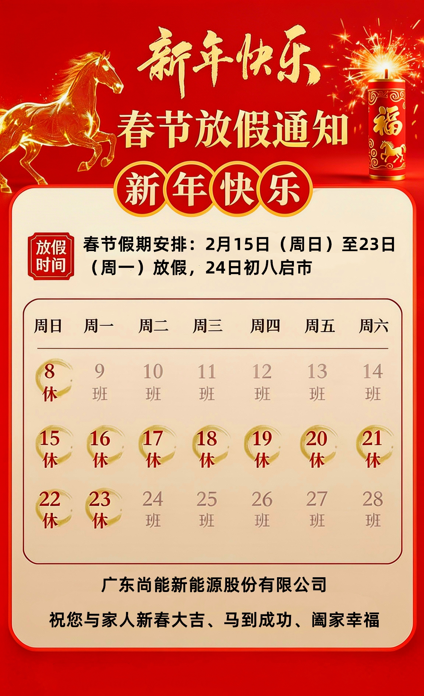 2月15日(腊月廿八)至2月23日(正月初七),2月24日(正月初八)正式启市,期待与您再共创佳绩!